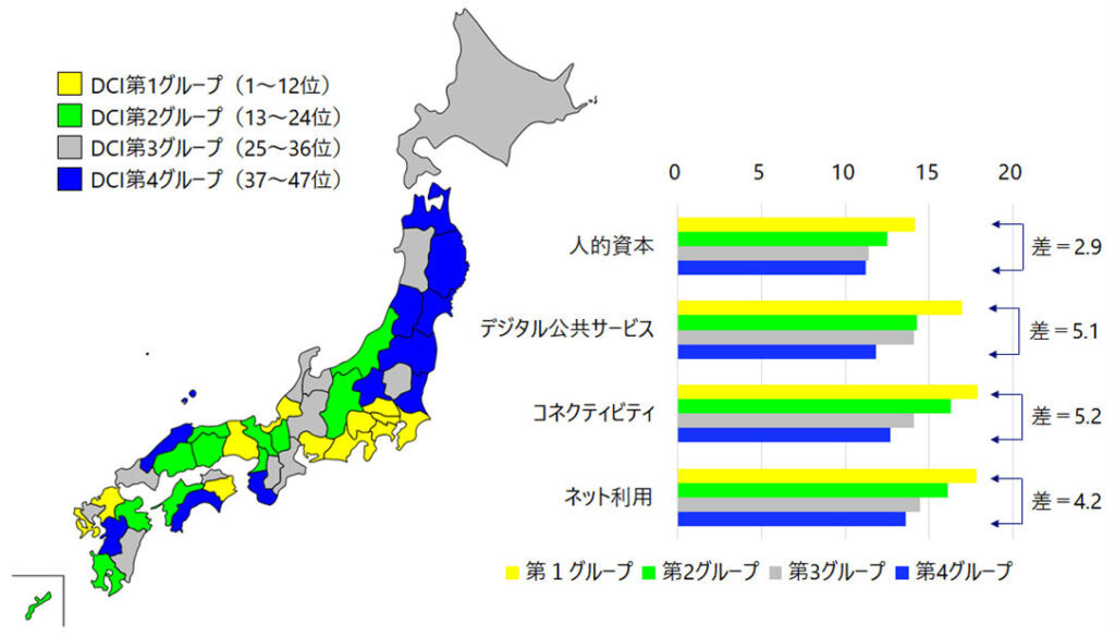 野村総合研究所(NRI)が発表する「都道府県別デジタル・ケイパビリティ・インデックス(DCI)」は、①市民のネット利用、②デジタル公共サービス、③コネクティビティ(端末・通信インフラ)、④人的資本(デジタルスキル)の4要素で構成される指標です。