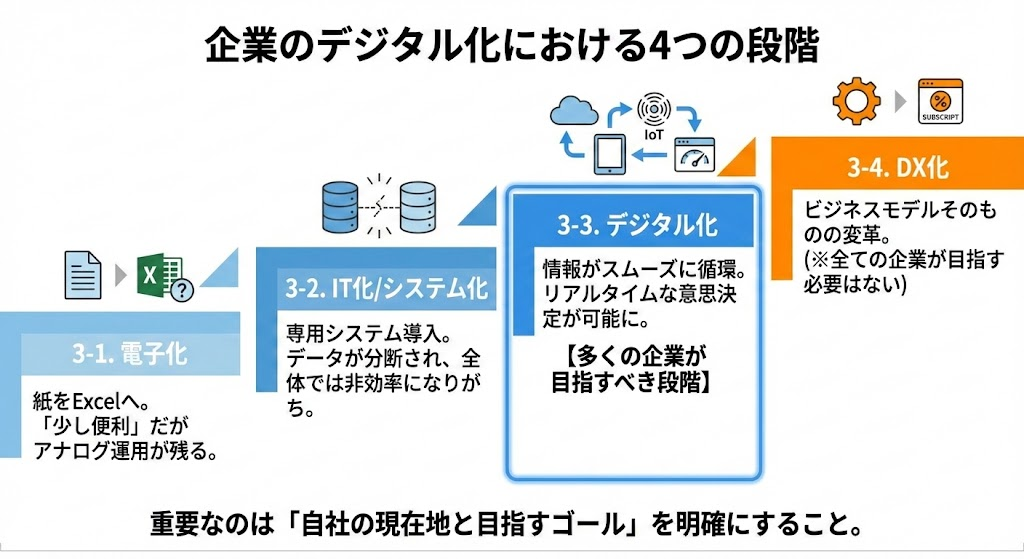静岡企業のDXが停滞する背景には「目的の不明確さ」もあります。ここでは、デジタル化の進度を4段階に整理します。
