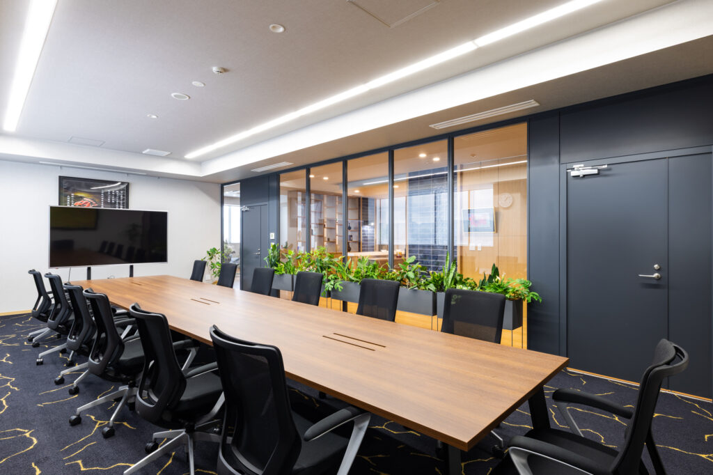 会議室にはロングテーブルを設置し、大型モニターを活用した円滑なコミュニケーションを実現しています。すべての参加者がモニター画面を見やすいよう、テーブルは特注の台形型を採用。視認性と快適性を両立した設計で、効率的かつストレスのない会議環境を整えています。
