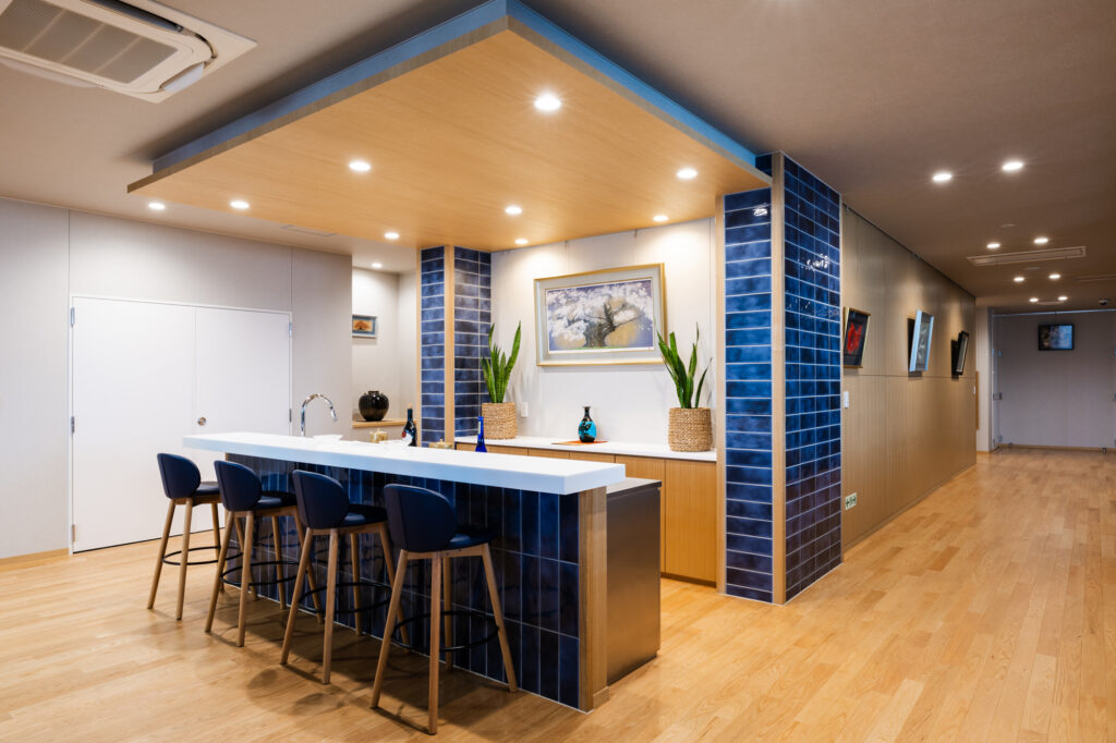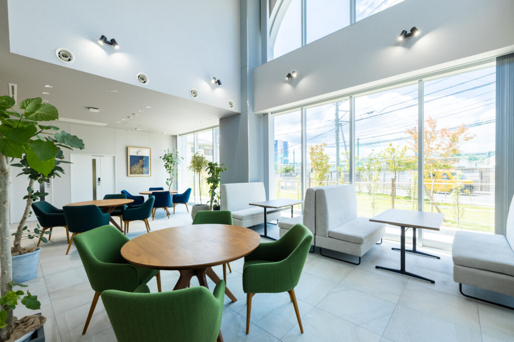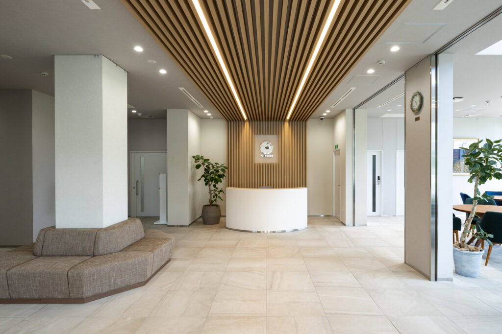 ホワイトを基調としたエントランスは、空間全体に明るさと清潔感をもたらし、企業の信頼性と透明性を象徴します。そこへアクセントカラーのブルーとグリーンが知性と安心感を添えることで、来訪者に落ち着きを与え、上質な空間に仕上げました。